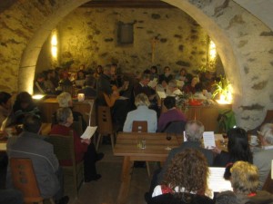 Sie saßen eng zusammen in der warmen Stube. Ernst Thoma brachte die SängerInnen die aus Nah und Fern gekommen waren in musikalische Bewegung und es wurde gejodelt, gesungen, getanzt und bis spät in die Nacht diskutiert. Gernot Niederfriniger spielte auf der Steirischen und unterstützte die SängerInnen und Martina Wienchol jodelte vor und alle jodelten mit und so wurde das 1. Offene Singenauf der Tschenglsburg zu einem freundlichen und angenehmen Singabend.