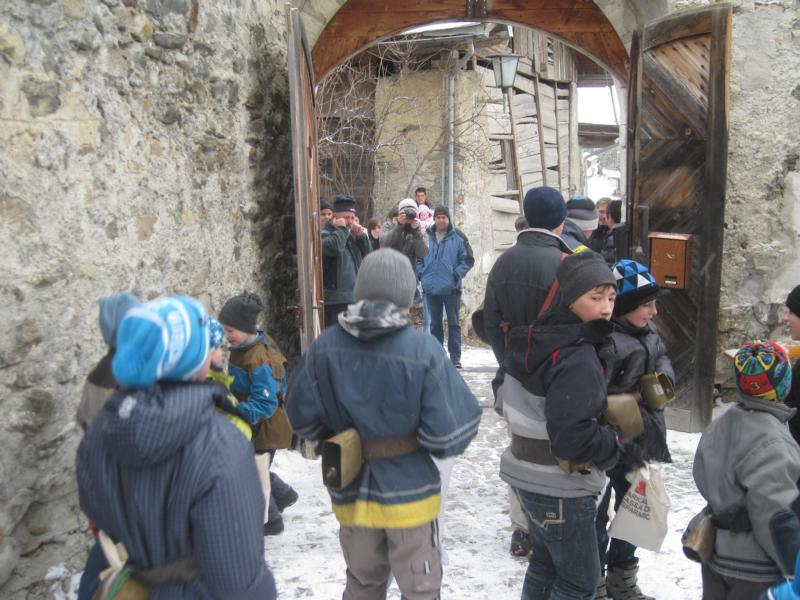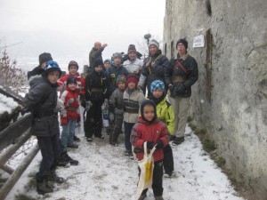 Der Vinschgau hatte sich ein weißes Festtagsgewand angezogen und in Tschengls gehen Kinder und Erwachsene zur Tschenglsburg. Schellenrennen ist heute und noch sind die Schellen stumm gestopft. Pünktlich um zwölf Uhr beginnen die Kirchturmglocken der Pfarrkirche zu läuten und die mehr als 20 Schellenkinder werden still und lauschen andächtig dem bedeutungsvollen Geläut. Die anwesenden Fernsehjournalisten haben jetzt alle Hände voll zu tun, wollen sie doch diesen ganz besonderen Moment für einen Dokumentarfilm erfassen. Die Glocken verstummen und nun ist für einen Moment alles still. Die Stille ist nicht bedrückend, sondern öffnet mit ihrer Kraft die Fähigkeit zum Gebet. Johann gibt kurze Anweisungen und nun zeichnen alle das Kreuzzeichen auf ihre Stirn und beginnen zu beten. Und das Gebet der Kinder legt sich als Dank an das vergangene Jahr in die Mittagszeit und ein spürbarer Friede legt sich auf das weißgekleidete Dorf. Alles hat seine Ordnung und so beginnt die drittgrößte Glocke ihren Ruf und das betreffende Kind bewegt im Rhythmus seinen Körper und das Schellen wird stärker und wird nun von einer größeren – der zweitgrößten Glocke – abgelöst und schließlich ertönt die größte Schelle. Johann hilft dem Schellenkind beim Schellen und plötzlich schellen alle drei gemeinsam und schon stimmen auch die anderen Schellenkinder mit ein und sie springen und hüpfen und schellen begeistert in den Wintertag, den letzten in diesem Jahr 2011. Neben den Schellen haben die Kinder Stofftaschen mitgebracht und im Innenhof der Burg verteilt der Schlosswirt allerlei Süßigkeiten. Gerne halten die Schellenkinder ihre Taschen dem Wirt entgegen und dankbar nehmen sie die kleinen Gaben an. So werden sie jetzt durch das Dorf ziehen und bei den Familien schellen und das Jahr verabschieden und das Neue Jahr begrüßen. Schellenkinder, das habt ihr großartig gemacht. Danke. Und auch Dir, lieber Johann, herzlichen Dank für Deine wertvollen Anweisungen.