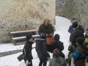 der Schlosswirt Karl Perfler beim Verteilen der kleinen Gaben