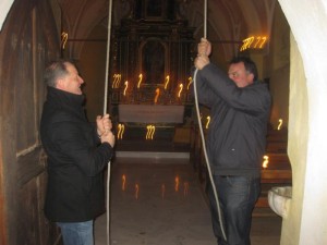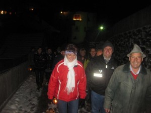 Die Schellenkinder sind in ihre Heimathäuser zurückgekehrt und pünktlich um 23.00 Uhr macht sich eine Gruppe von Silvesterpilgern auf den Weg zur Ottilia Kirche. Gestartet wird in der Tschenglsburg und unterwegs kommen weitere Silvesterpilger zur Gruppe dazu. Hans Raffeiner betet vor und das Gebet klingt durch die Nacht. Die Bittgänger haben Laternen mitgebracht und die vielen Kerzenlichter geben der Dunkelheit Bewegung und Wärme. Der Boden unter den Füßen fühlt sich sicher und weich und weiß  an und alle gehen sie betend und in Gedanken durch die Nacht und eine große unendliche Stille liegt in den weißen Feldern und Wiesen und ganz vorne das schwache Licht der Ottilia Kirche. Die Glocken der Ottilia Kirche beginnen zu läuten und laden ein. Wärmendes Kerzenlicht empfängt die Pilger in der kleinen Kirche und Heidi Pixner ist mit ihrer Harfe da. Zuerst aber wird das Lied „Stille Nacht“ gemeinsam gesungen und eine große Harmonie legt sich in den Kirchenraum. Heidi Pixner beginnt sanft und voller Zartheit, zupft und streichelt die Saiten der Harfe und Musik aus dem Innersten heraus wird geboren und erreicht die sehnsuchtsvollen Menschen. Musik als höhere Sprache, als Ausdruck einer großen unmessbaren Dimension. Inzwischen hört man draußen in den Dörfern die ersten Böllerschüsse und niemand will so richtig aufstehen und die Kirche verlassen. Wie schön es jetzt in der Stille ist nach dieser wunderbaren Musik von Heidi Pixner und in dieser freundlichen und wohltuenden Gemeinschaft. Alles Gute, hört man überall und die Leute die heute zur Ottilia Kirche gekommen sind, meinen es ehrlich und wünschen sich und den Anderen, dass neben dem Lärm der Zeit endlich auch die Stille, die Kostbarkeit der Stille ihren Platz finden sollte, damit die Menschen die Möglichkeit und Fähigkeit finden mit sich selbst in Dialog zu treten und damit bewusster, selbstbewusster und freier zu werden. Ein unvergesslicher Festtag in Tschengls – die Schellenkinder und die Bittgänger haben es erleben dürfen.