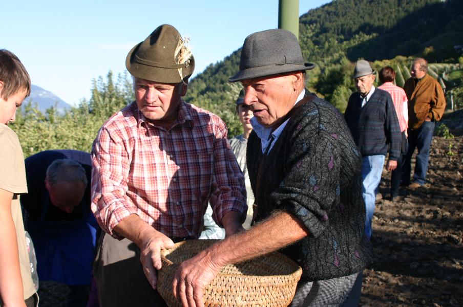 Die Kirchenglocke der Pfarrkirche von Tschengls ruft zur Morgenandacht: AVE Maria Läuten. Alle die mithelfen wollen, das Korn zu schneiden versammeln sich um 05.30 Uhr vor der Pfarrkirche und gehen gemeinsam zum Kornfeld bei der St. Ottilia Kirche. Die Arbeitsgeräte stehen bereit.Nach dem Kornschnitt sind alle freiwilligen HelferInnen zu einem „Holbmittog“ auf dem Acker eingeladen.