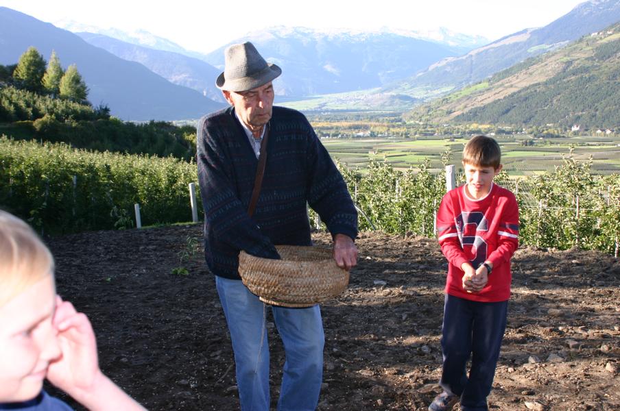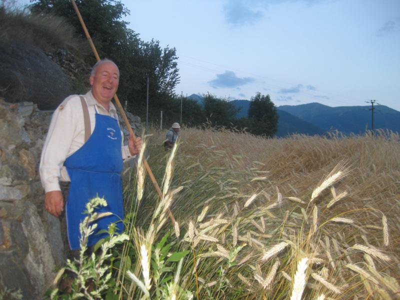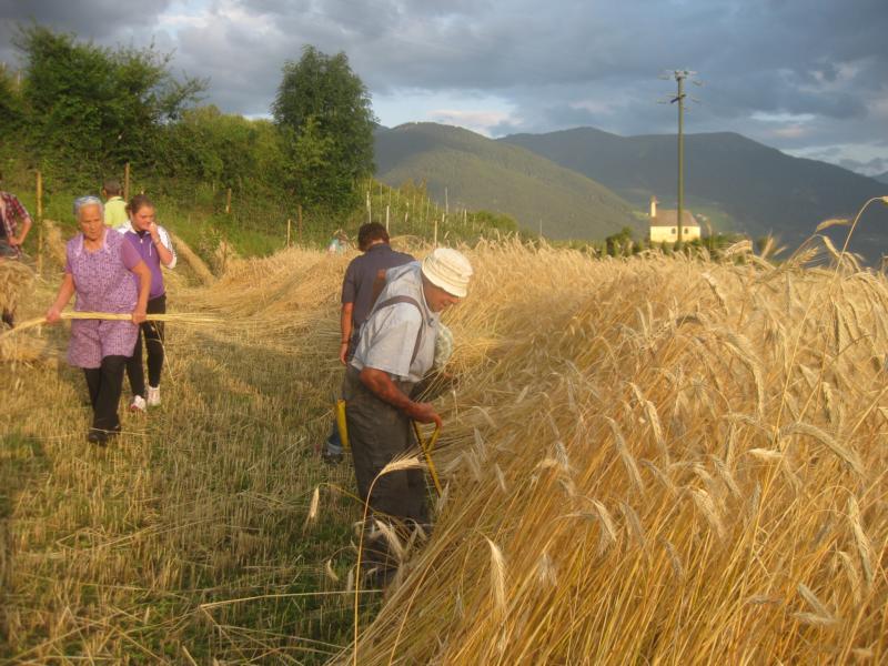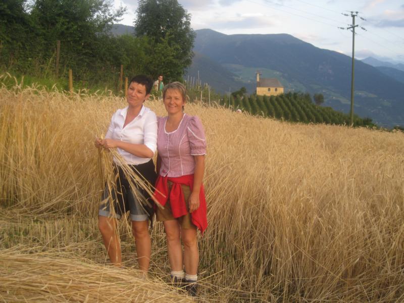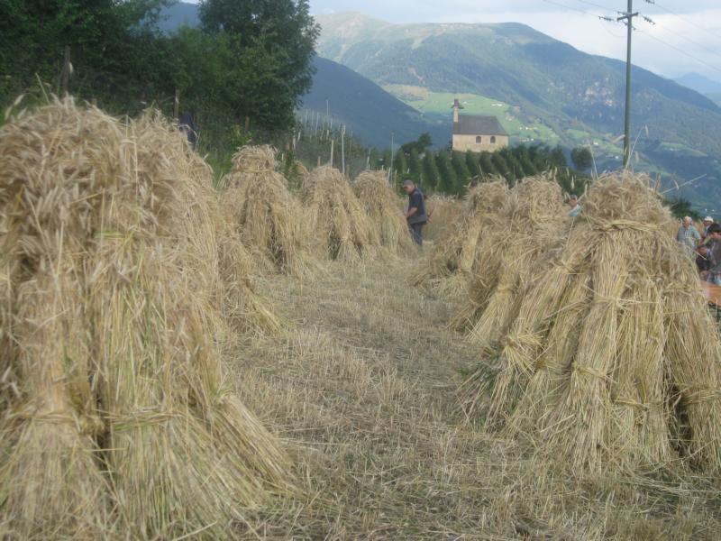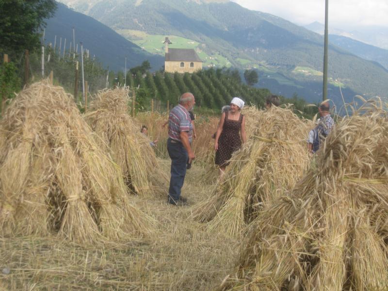 Fast wäre ich zu spät gekommen, obwohl ich heute morgen sehr früh aufgestanden bin. Die Ave Maria Glocke hat mich beim Zubereiten des Frühstücks für die Kornschneider-Gemeinschaft begleitet und so standen sie bereits alle da vor der Pfarrkirche und warteten. Der Tag sucht noch nach dem Morgenlicht und JUng und Alt machen sich auf den Weg in Richtung Ottiliakirche. Schweigen und hie und da Worte die Freude ausdrücken und eine lebensfrohe Gruppe von Tschenglsern ist auf dem Weg zum Kornacker. Karl Tscholl, der Altbauer, ist schon bei der Arbeit als die Gruppe das Kornfeld erreicht und gekonnt schneidet er mit einer Sense die Roggenhalme. Die Weisheit der Erfahrung steht jetzt im Mittelpunkt und all jene die bereits mit dem Kornschneiden vertraut sind, zeigen den erwartungsvollen und neugierigen Mithelfern wie man schneidet, Bänder macht und die Garben bindet. Bald schon ist es still auf dem kleinen Ackerfeld, das ins weite Tal schaut und jeder ist beschäftigt und bei der Arbeit und die Kinder fragen und die Alten antworten, geben geduldig Anweisungen und die Bänder liegen für die Garben bereit und von den Berghorizonten zeigt sich junges Morgenlicht. Nur vom Obervinschgau drohen schwarze Wolken. Sie stören den wunderbaren Kornfrieden aber nicht. Im Gegenteil: in diesen Gewitterwolken zeigt sich alsbald und zur Freude aller Anwesenden ein farbenfroher und ausdrucksstarker Regenbogen und es ist als würde Vater Himmel in diesem Moment und für eine lange stille Zeit, Mutter Erde küssen und das ganze Tal umarmen. Immer mehr Menschen kommen zum Kornacker und es duftet nach frischem Kaffee, nach Marillenmarmelade und frischem Bauernbrot. Mein Blick aber und meine Gedanken sind auf den Sonnenberg gerichtet. Auf jenen Berg der über viele Jahrhunderte die Kornkammer der Alpen war. Nicht ohne Grund: das Getreide konnte auf diesem Berg der Sonne hervorragend gedeihen, denn die Sonne und der frische Wind sind Freunde der Getreidearten und der Ertrag war dementsprechend gut und lohnend. Von weit her sind in den vergangenen Jahrzehnten neue Anweisungen gekommen und ohne sich etwas zu denken, sind die Bauern diesen Bestimmungen gefolgt. Die goldenen Äcker sind nicht mehr und das Getreide für unser Brot wird inzwischen durch die Luft geflogen und wir reden von Vintschger und Ultner Brot und merken gar nicht, dass wir das eigenständige Denken verlernt haben. Nein, wir haben kaum noch aufrichtiges Vintschger Brot. Wir belügen uns selbst. Die Kornäcker aber sind noch da und sie wollen erlöst werden vom Aufgezwungenen und wollen wieder Brot schenken. Dazu aber braucht es ein Neues Überdenken, ein Neues Schauen. In der Talsohle erzählen die Apfelwiesen vom Fleiß und vom Einsatz der Bauern. Wir müssen keine Apfelbäume ausreißen, um Raum und Platz für die Kornäcker zu haben. Wir sollten aber in den Randgebieten und besonders auf dem Sonnenberg mit neuen Kornäckern die Arbeit im Tal aufwerten und dem ganzen Tal eine positive Erzählung geben. Die Vögel singen wieder und in der Erde leben viele Würmer und Kleintiere und gemeinsam wollen wir, in gemeinsamen Respekt und in der Gewissheit, dass wir nebeneinander Platz haben, dass Äpfel und Korn und Wiesen und Kirschen und Marillen und Beeren gut miteinander auskommen, sich gegenseitig ergänzen und dem Tal eine erfüllende Gesamtheit geben können, an einer neuen Heimat bauen. Eine Heimat die aus großen und kleinen Wirklichkeiten besteht und in der eine aufbauende Gesprächskultur herrscht und mithilft im gemeinsamen Miteinander zu leben und zu wachsen.