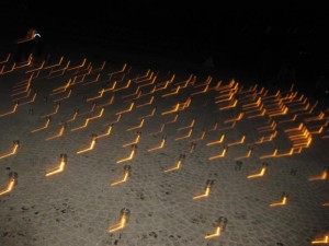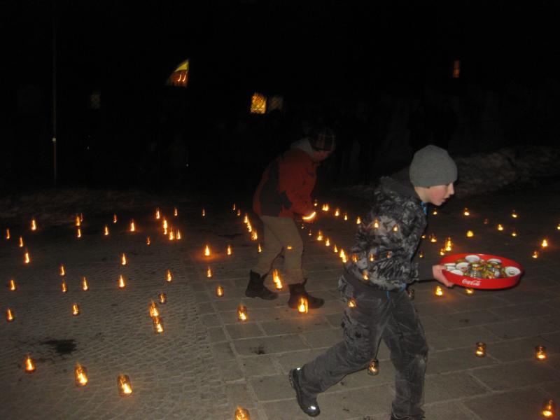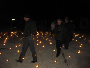 Und die Lichter hatten es heute Abend sicherlich nicht leicht. Sie hatten mit starker Gegenwehr zu kämpfen. Kalter Wind wollte sie immer wieder ausblasen. Der Wille, die Begeisterung und das Vertrauen der Menschen, die mitgeholfen haben und die die Lichter vorbereitet haben, haben sich aber durch gesetzt und sind heute Abend beim Fest für den Frieden Symbol für das Neue Licht, die Neue Sonne.
